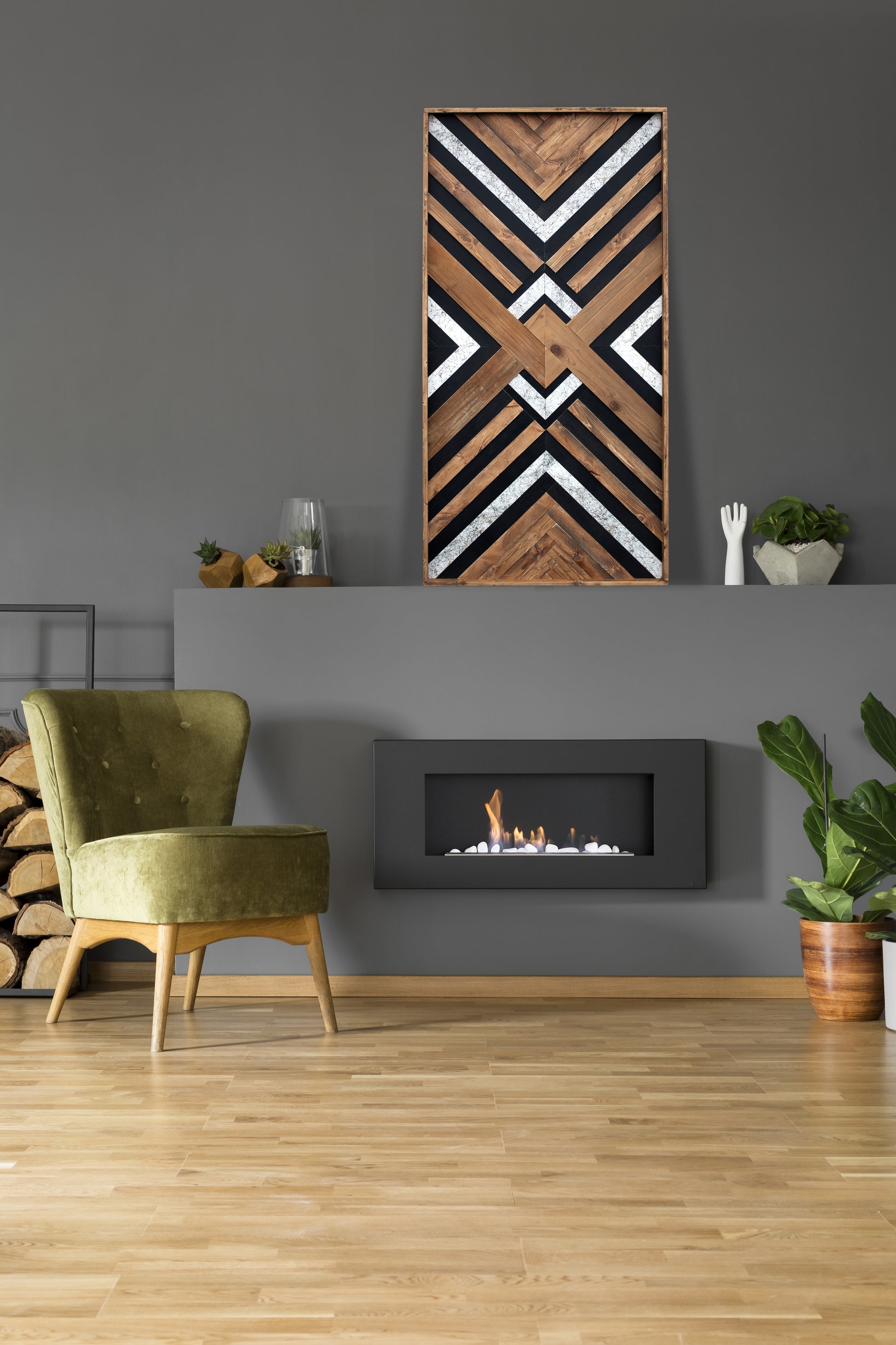 These one-of-a-kind wood mosaics are perfect above a bed, on top of a mantle, or on their own.