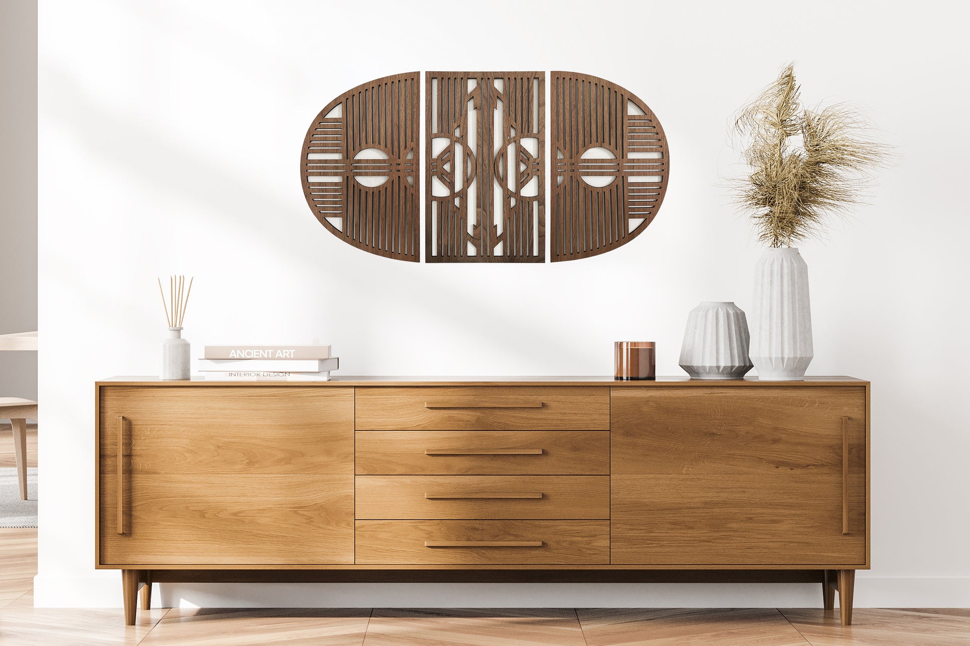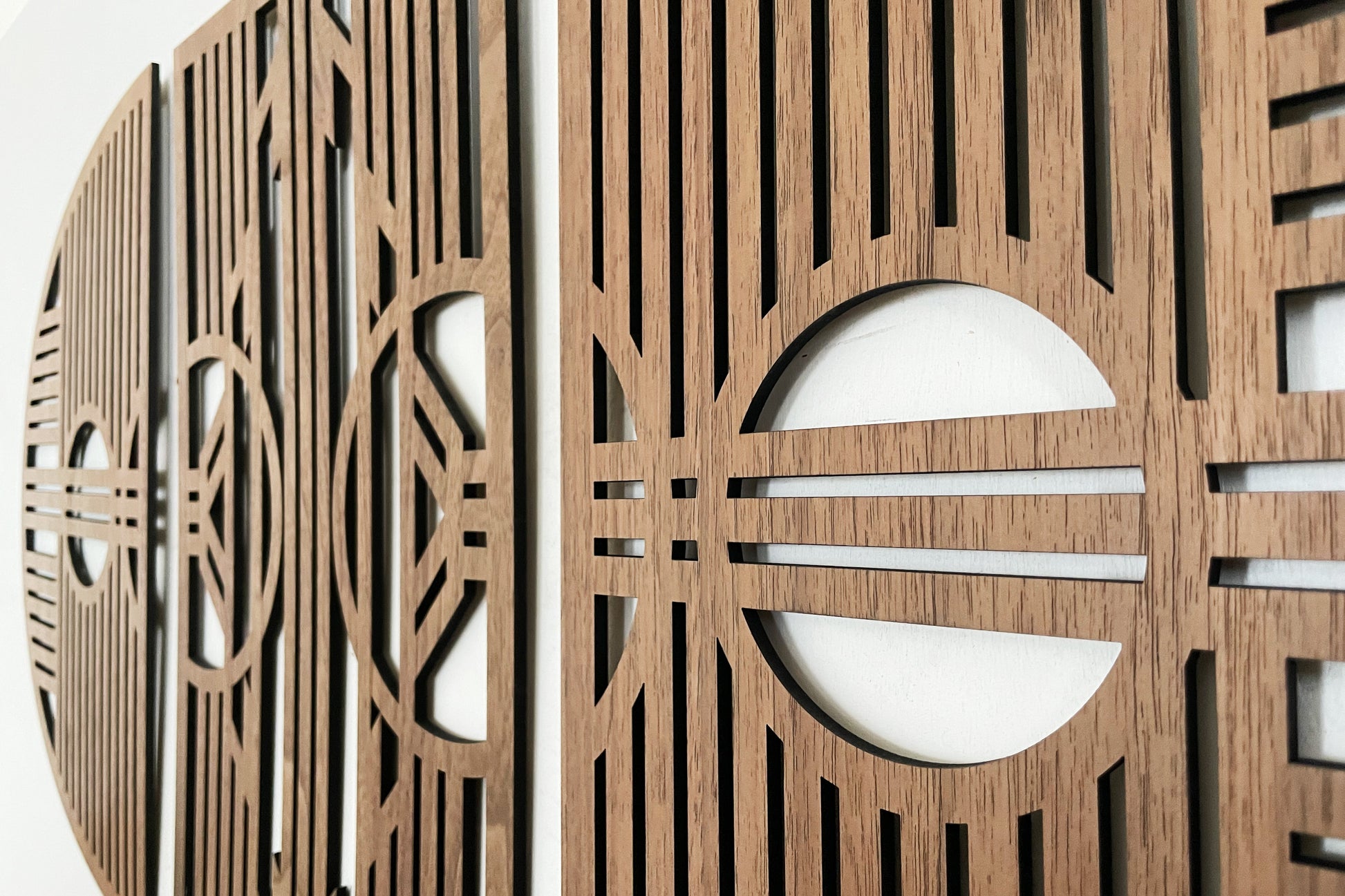 Crafted from natural walnut, each of the three panels measures approximately 11.5" x 18.5". The richness of the wood grain contrasts beautifully with the open air of the design, ensuring no two sets are ever alike.