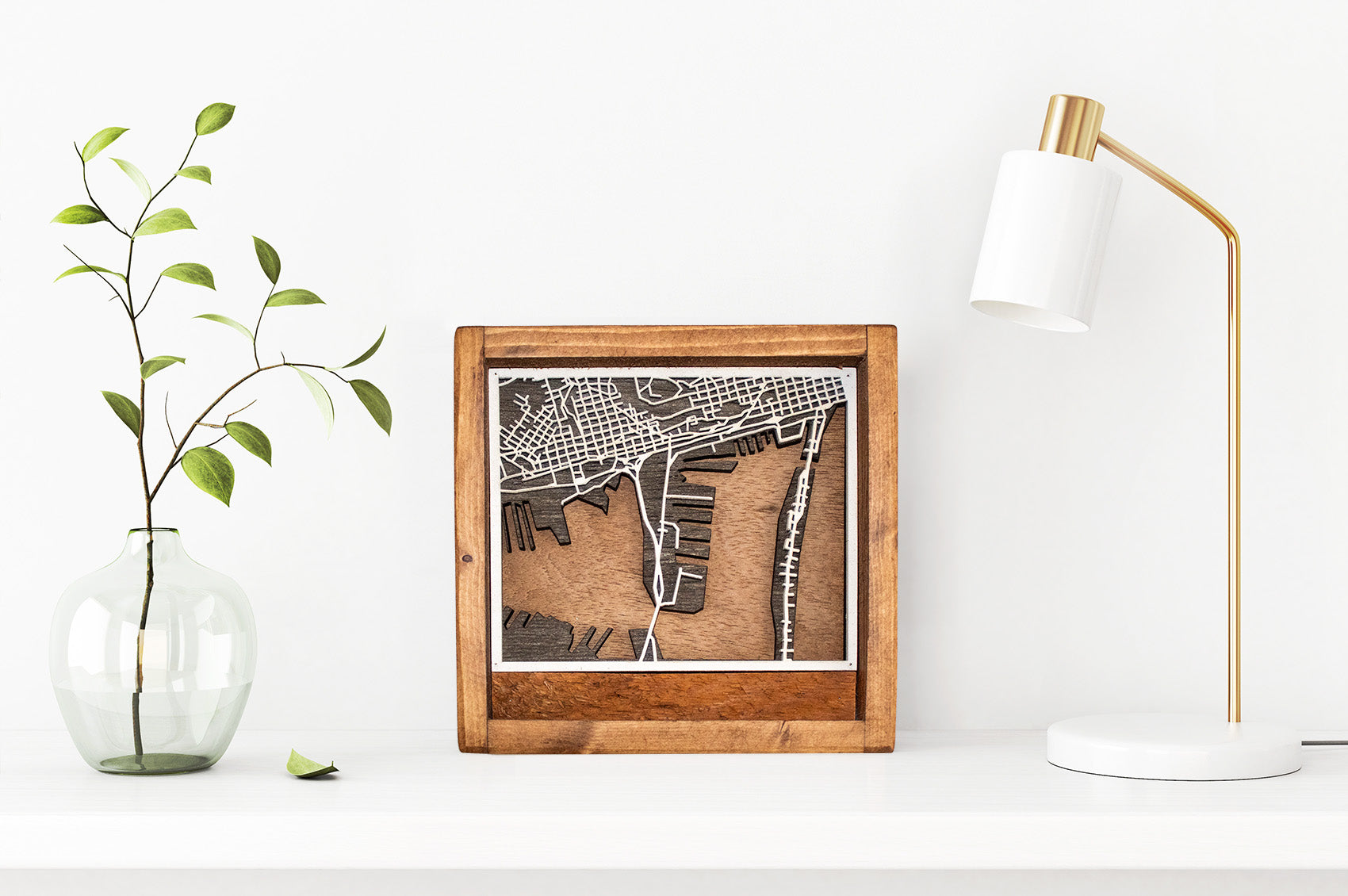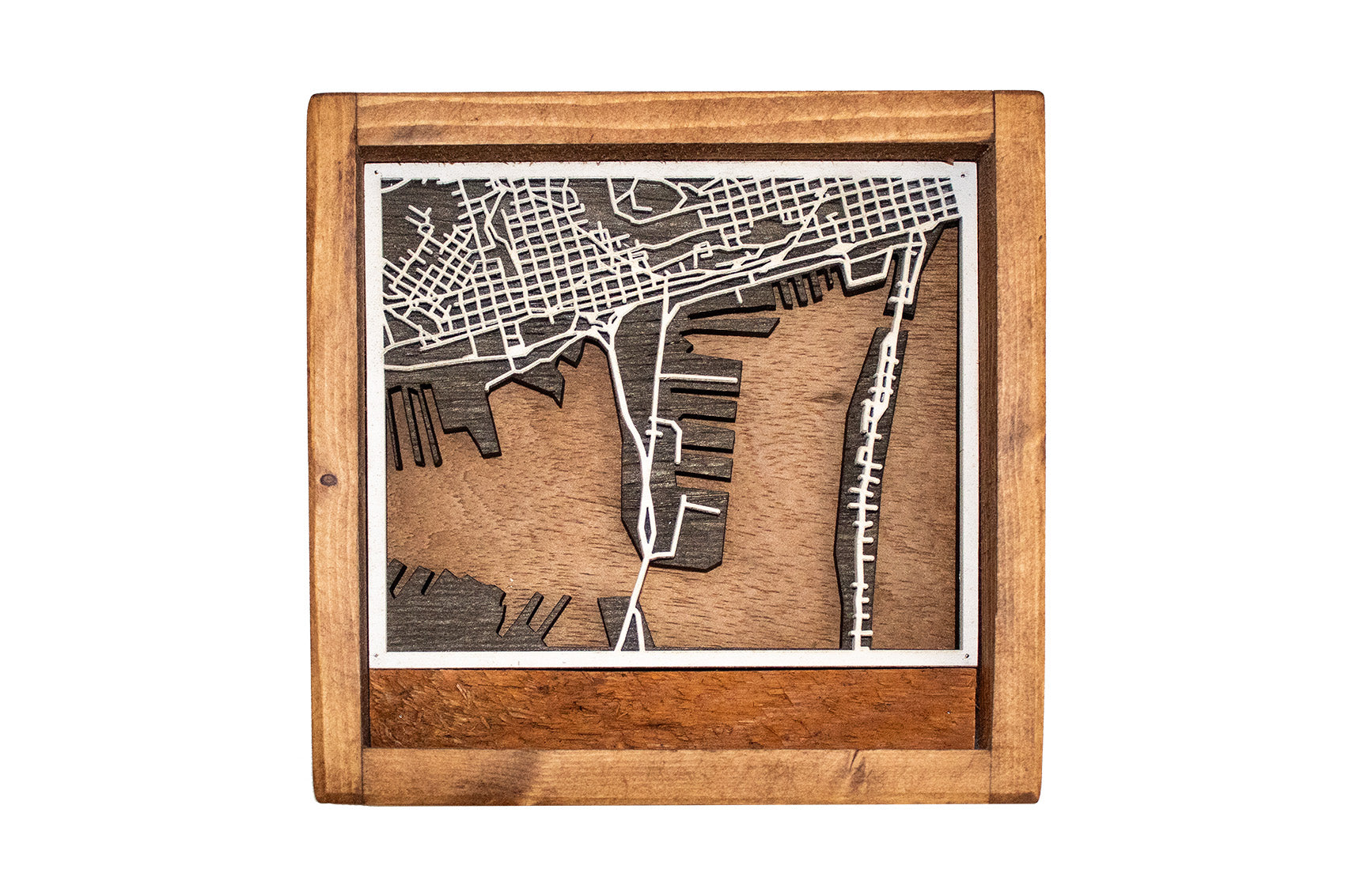 The Zenith City Collection is inspired by our great love for Duluth and the rich history that makes this city our home. Each piece is embellished with wood taken from the Peter J. Peterson House. Built in 1867, it is the oldest known homestead recorded within the city lines of Duluth, MN, and remains a home to this day. The name is inspired by Duluth’s nickname that has stuck since 1868, when the Editor of Duluth’s first newspaper coined Duluth as “The Zenith City of the Unsalted Seas.” Whether a mosaic or map art, each holds a piece of local history.