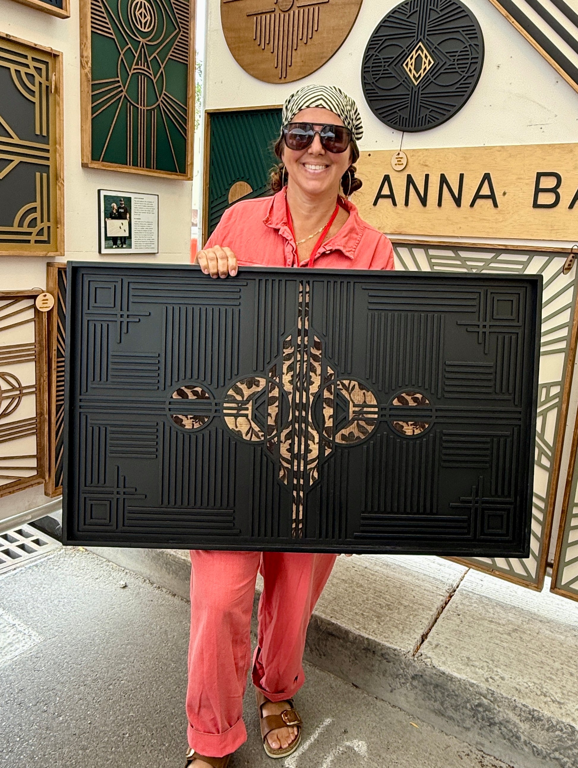 The Wisteria design is a true original—an artwork where Art Nouveau meets Art Deco. With its matte black backer and frame, Wisteria creates a dramatic foundation for the floral-inspired inserts, which bring movement, grace, and timeless elegance to the piece. At approximately 23” x 39”, it’s bold yet refined, an unforgettable design that Anna calls her favorite.