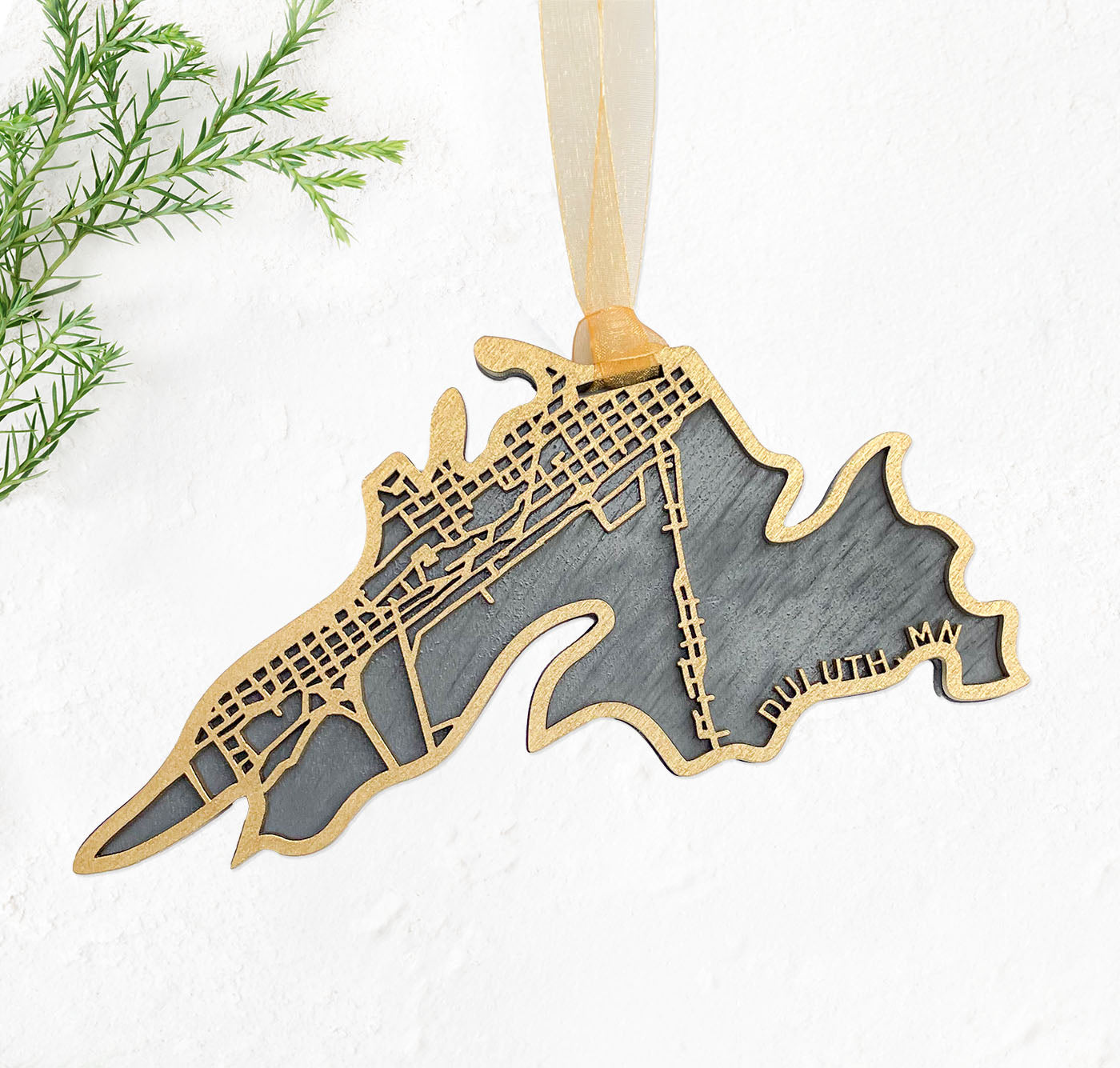 The Zenith City Ornament measures approx. 4”x7” with ribbon hanging approx. 3.5”